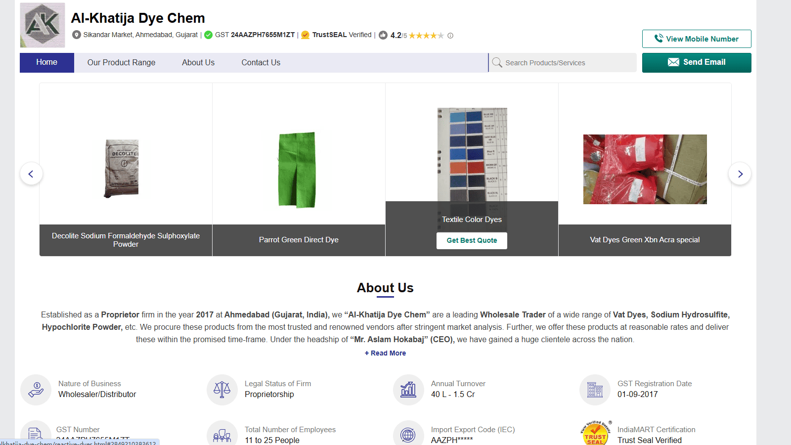 Profile:Established as a Proprietor firm in the year 2017 at Ahmedabad (Gujarat, India), Al-Khatija Dye Chem is a leading Wholesale Trader offering a wide range of Vat Dyes, Sodium Hydrosulfite, Hypochlorite Powder, and more. These products are sourced from the most trusted and renowned vendors after thorough market analysis. The company ensures competitive pricing and timely delivery of products. Under the leadership of Mr. Aslam Hokabaj (CEO), Al-Khatija Dye Chem has built a vast clientele across the nation.